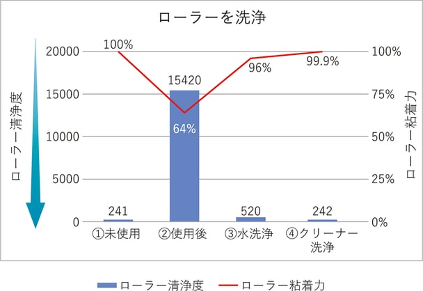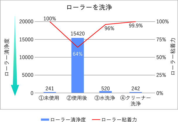 ■ 試験内容:ボディローラー表面の清浄度と粘着力を測定する。測定のタイミングは4点。