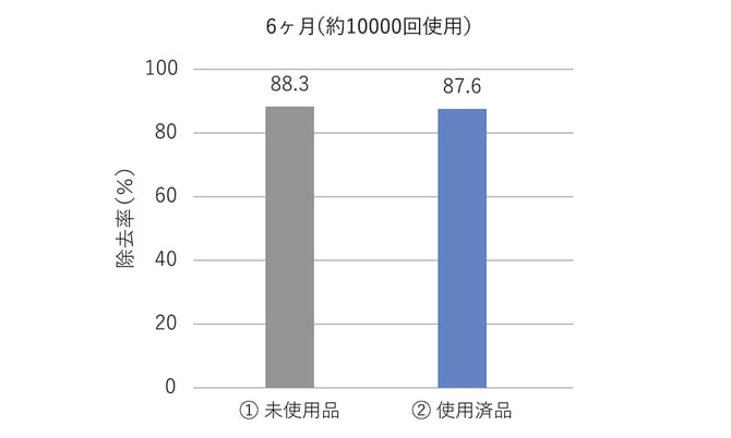 6ヶ月運用した使用済ボディローラーと未使用ボディローラーで、クリーンウェアをローラー掛けする。ローラー掛け前後のウェアの清浄度から除去率を求めて、それらを比較する。