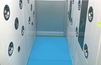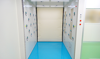 自社工場のエアシャワー内の床全体にステップマットを設置。めくるタイプのマットよりも素材がやわらかく、汚れがよく取れるので社内でも話題になっているそうです。