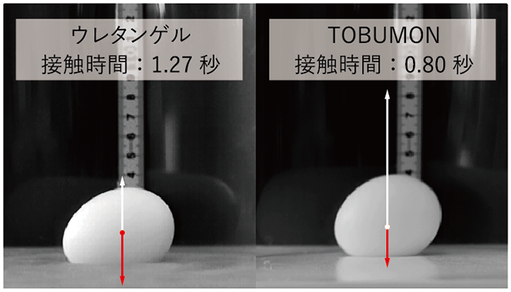 粘性が強いポリウレタン樹脂では難しかった、80%以上の反発弾性力をもつ新素材です。シリコンを超える反発弾性をもち、シューズの緩衝材や振動遮断材料等にご使用いただけます。